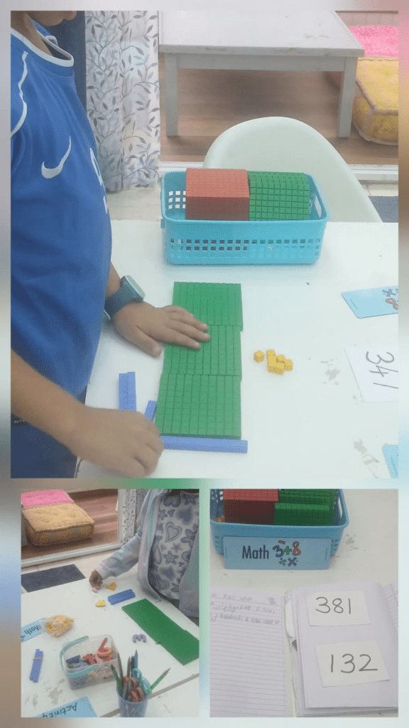 Neev and Mayra (7 years 4 months) explored place value through a series of engaging, hands-on activities. They began by using a building block mat to represent place value and solve given sums. The concept of regrouping and decomposition was introduced through “trading” in place value, which they applied while solving trading sums, with Neev taking a little extra time to complete the task.