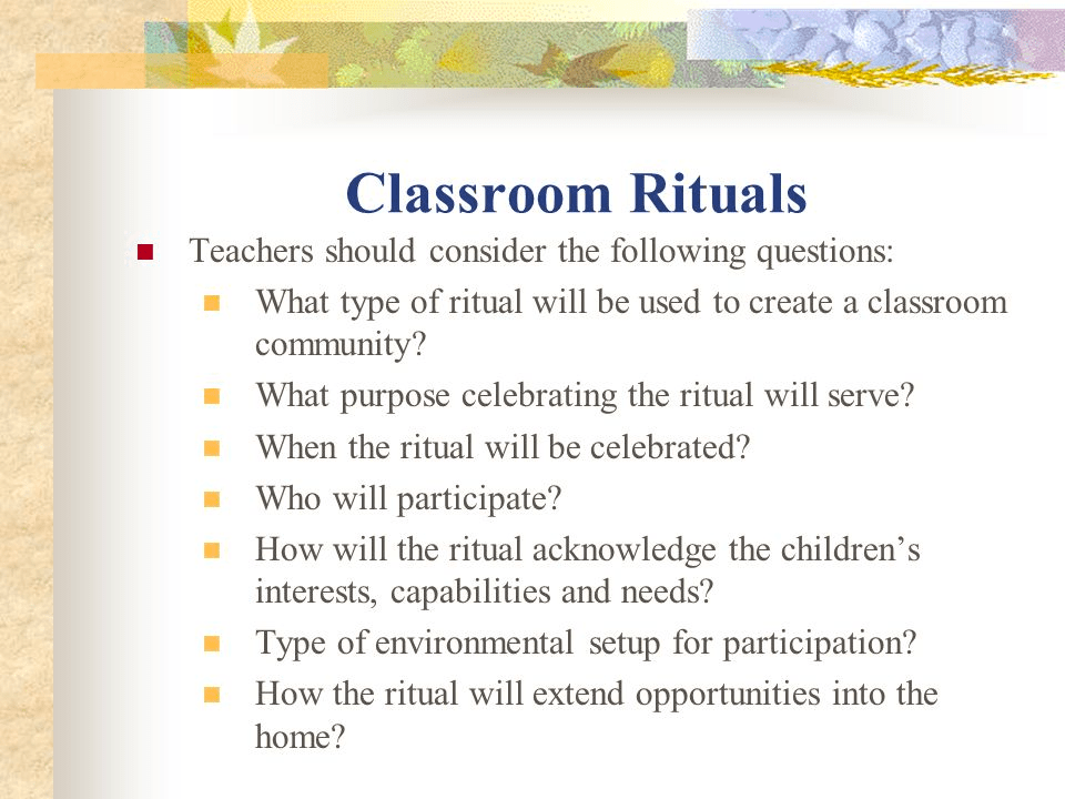 What is the benefit of routine and ritual in individual, family, community, and nation’s journey? Do we need to create some, review others, reject some, respect others’ rituals, or judge them? What are your thoughts about rituals? Perhaps time to think, and discuss with your friends/family/fellow educators and your classroom students. Here are some ideas to get you started.