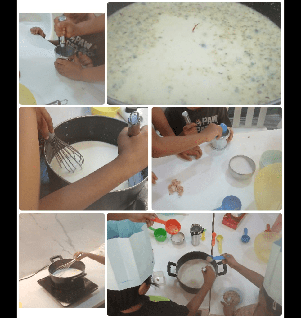 This week, our little chefs had a fun time making Thandai, a yummy Indian drink enjoyed during summer and the Holi festival. They learned why this drink is special and explored ingredients like saffron, which gives a pretty yellow color and a sweet smell. While preparing the drink, the children also picked up many learning skills. They used cups and spoons to measure ingredients (just like in math), noticed how warm milk helped sugar dissolve and saffron release its color (like in science), and used a blender to mix nuts and spices (learning how tools help us). They also used their senses to describe how the drink looked, smelled, and tasted, which sparked their creativity.