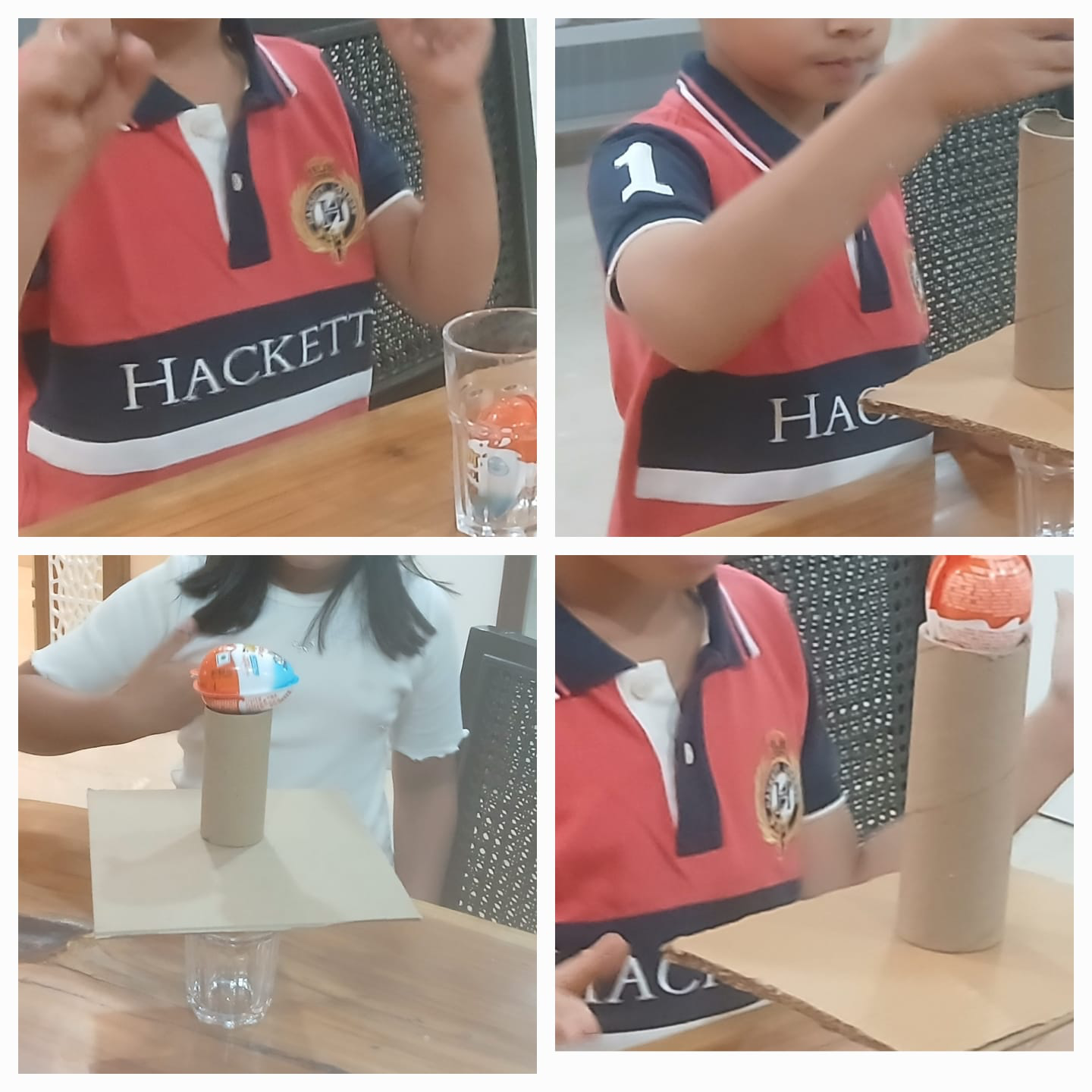 In our STEAM class, the children performed the Egg Inertia Experiment and explored the concept of inertia. They observed that when the tray and tube were swiftly removed, the egg dropped straight into the glass instead of moving with them. This demonstrated that objects at rest stay at rest unless acted upon. The children enjoyed the surprising outcome and learned that careful setup and quick movement were important for the experiment to work. After a few tries, they were thrilled to see the egg successfully land in the glass