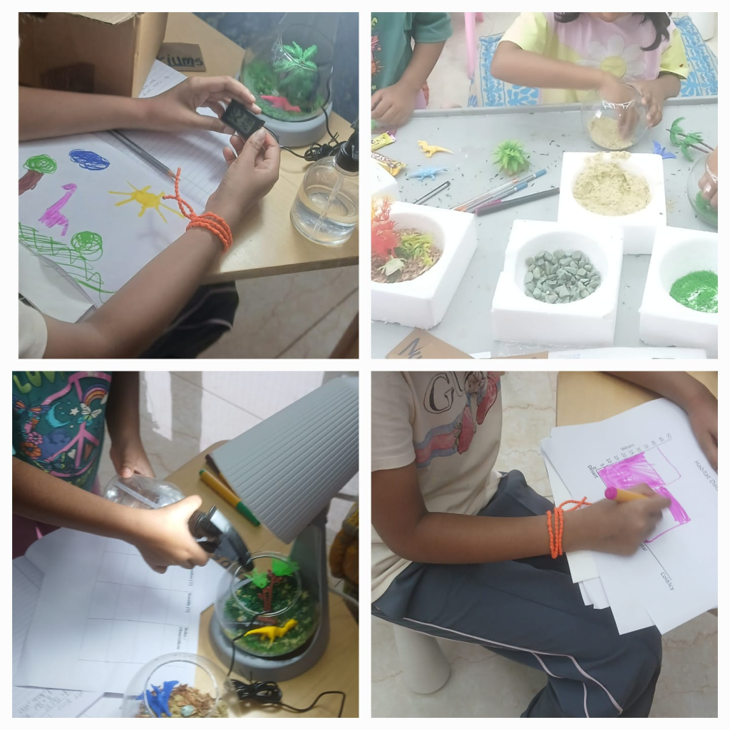The children explored how dinosaurs lived in different habitats by first observing images of deserts, jungles, and coastal areas from the Mesozoic Era. They discussed how animals needed the right climate to survive, making connections to examples like polar bears in the Arctic and camels in deserts. Each child then created their own mini dinosaur terrarium using soil, sand, rocks, plants, and toy dinosaurs to represent habitats such as hot deserts, wet jungles, and coastal areas. With the help of heat lamps and spray bottles, they investigated how temperature and humidity affected these environments, measuring and recording their findings with gauges.