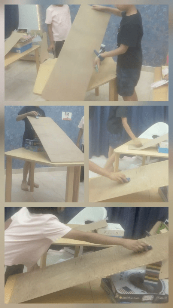 Through this activity, they understood that an inclined plane is a slanted surface that reduces effort, and that gravity, slope, and force affect how objects move. Neev & Mayra:7.7 years old