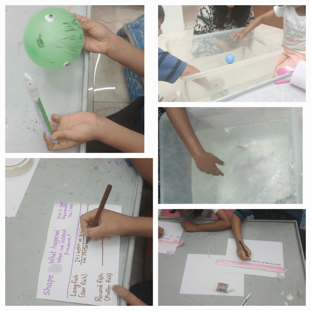 Neev & Mayra 6 year 11 months old children built and tested two types of model fish a round balloon fish and a long straw fish to investigate how different shapes respond to water pressure. The children discovered that the round fish got squished more easily, while the long fish stayed strong and flexible, just like the real oarfish that lives deep in the ocean. They recorded their observations using recording sheet and reflected on which shape would survive better under high pressure. They were able to share about why deep-sea fish are long and skinny, what happens when these fish are brought to the surface, and how submarines deal with pressure. To wrap up, everyone created their own colorful ribbon fish and took part in a fun quiz to share what they had learned. This hands-on activity helped them to understand how body shape and design help sea creatures adapt to extreme underwater environments