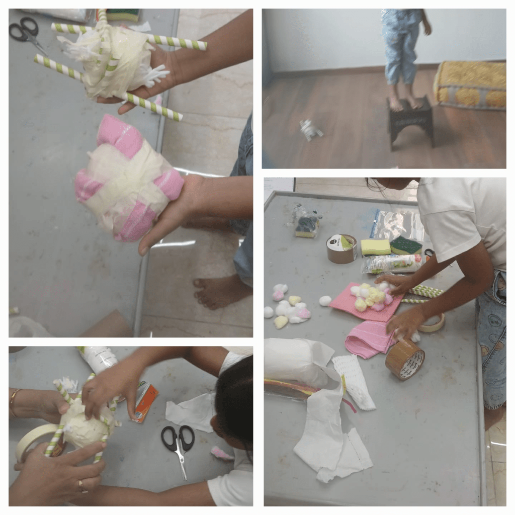 During the egg drop challenge activity, Tara learned about the science of impact and how soft, cushioning materials can help prevent damage. She applied her engineering skills to design two different egg protectors. In one, she used straws, foam, bubble wrap, and tape to create a strong and supportive structure. In the other, she used cotton pads, cloth, cotton balls, and tape to cushion the egg gently. After testing both designs, Tara observed that the eggs remained safe and thought about which materials worked best. This hands-on activity helped her understand real-world packaging and the importance of testing, problem-solving, and making improvements. Tara: 5 years 9 months